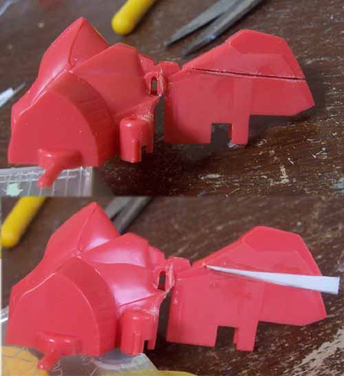 見ての通り、ノコで切れ目をギリギリまでいれて、それを斜めに曲げて、そこに三角状のプラ板を挟み込みました。