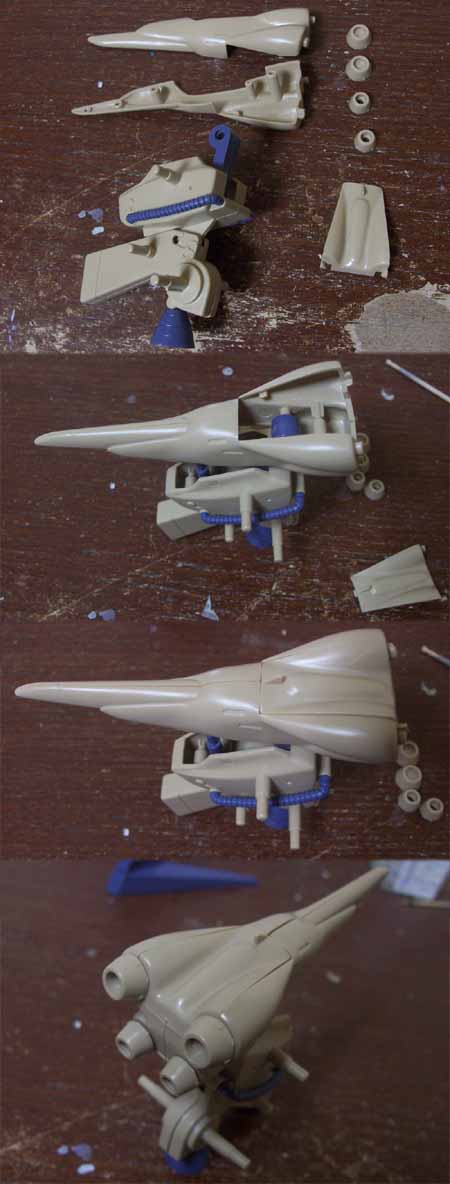 一部の手抜きやおかしなところ、首のシリンダー(横から見るとシリンダーだが、前から見るとただの板)とか、肩やスカートなどの装甲内部のスカスカ感など。これらを除けば、造形そのものはかなりいいのではないかと。