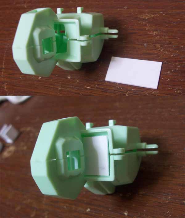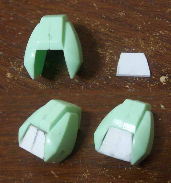 肩を接着してしまい、肩の内側の穴を埋めるために、サイズをあわせたプラ板を接着します。