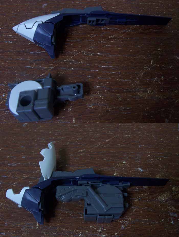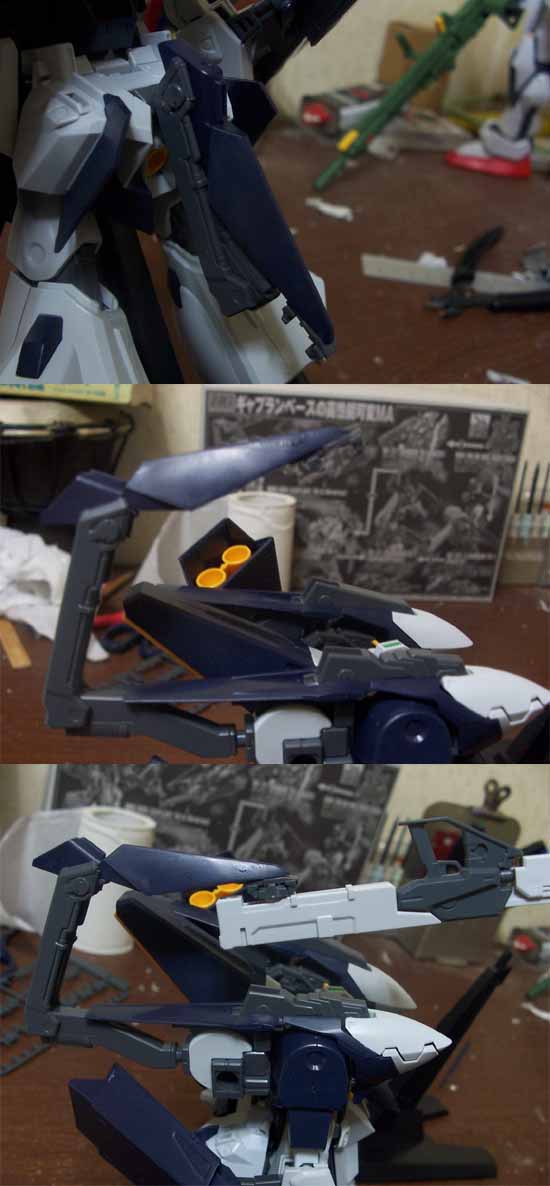 素のギャプランなら完全変形だったみたいですが、フライルーさんは肩の増加パーツの関係で、腕は差し替えとなります。