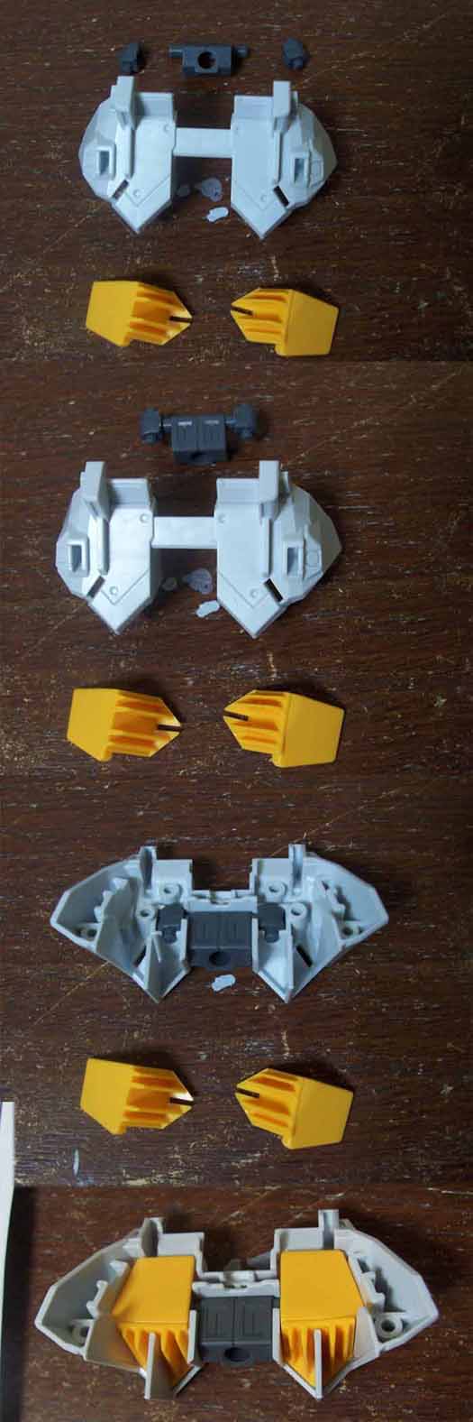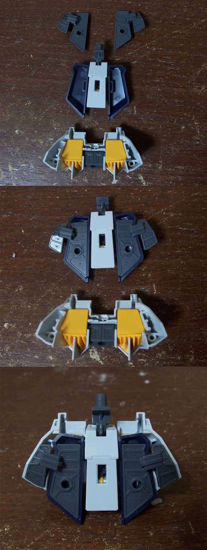 というのも、両肩を接続するパーツで、メインスラスターと首の根っこを挟み込むのですが、ここの部分を説明書は分かりにくく書いているんですよ。
