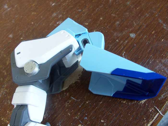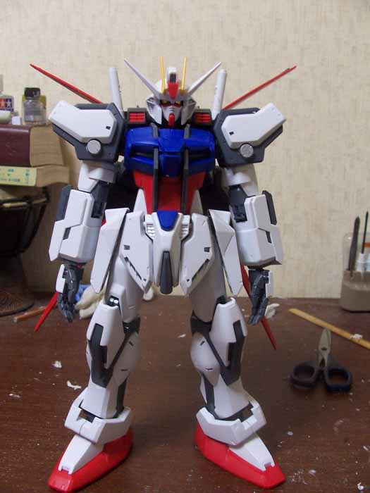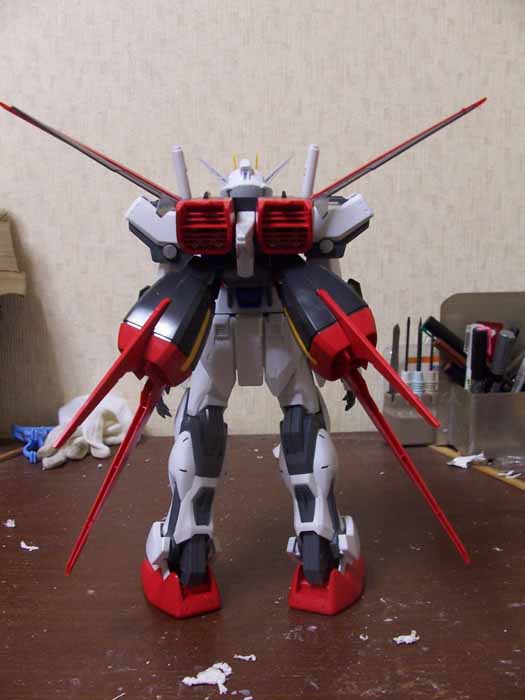 これでもかなり重心を前にずらしたと思います。と言うのも、エールストライクの完成の記事で書いたとおり、下のスラスターが稼動できるんですね。こいつを曲げれば、さらに後方に重心を集めることができますよ。