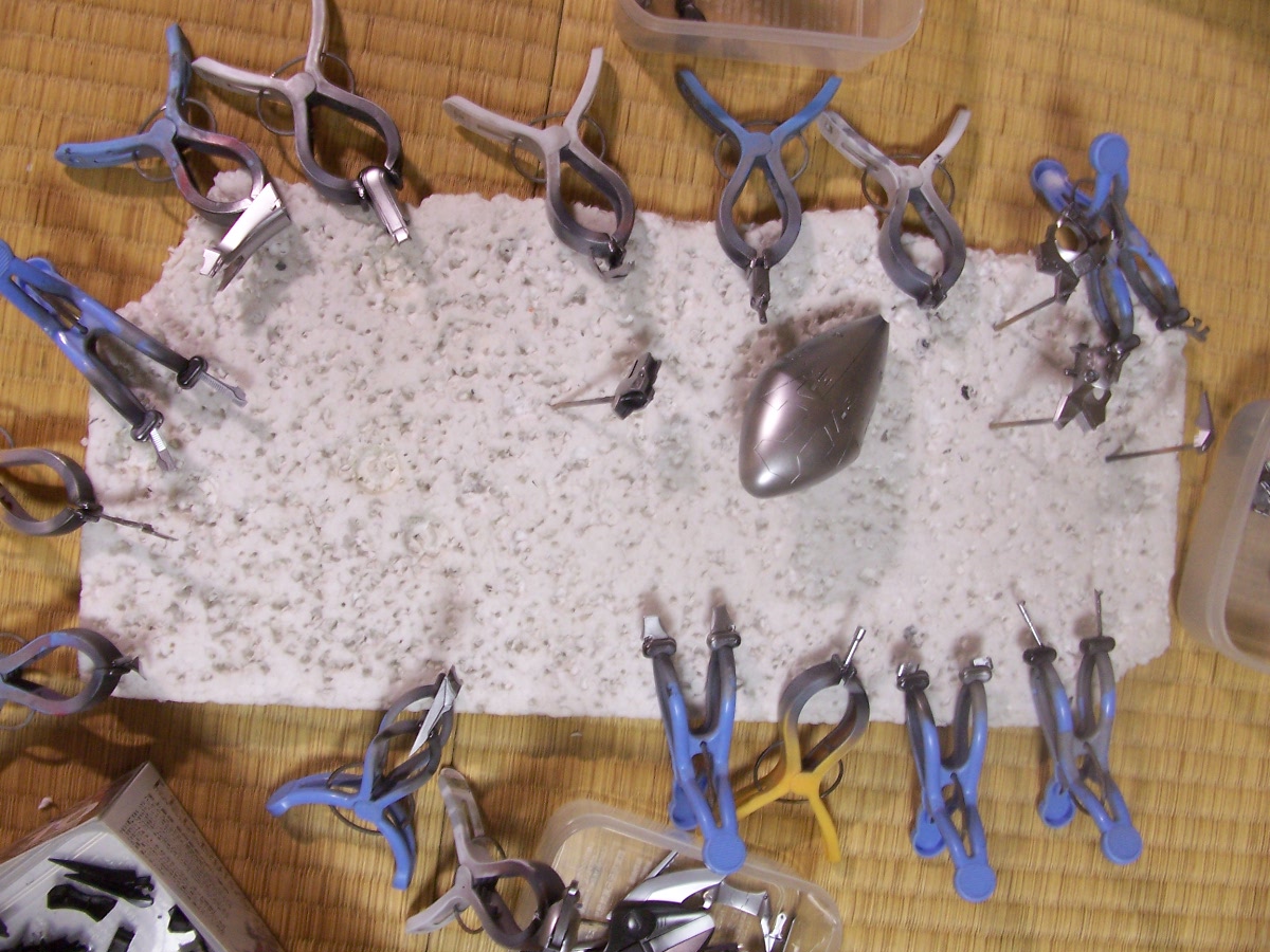 これで、サフ→下地黒→中塗りシルバー→白と塗装してきたわけですが、なんだってこんなに面倒な多重塗装をするのか?