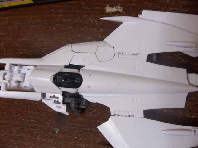 その後に、再度仮組み。ファイター形態の背面の装甲を面イチにしたまんま各部分をしっかりと収めることができるかの確認をしてのち、装甲パーツを接着です。