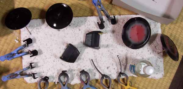 右の円盤みたいなパーツがありますね。この中央に黒が塗ってあります。ここは上にパーツを被せる場所なので、何をしても隠れるところです。